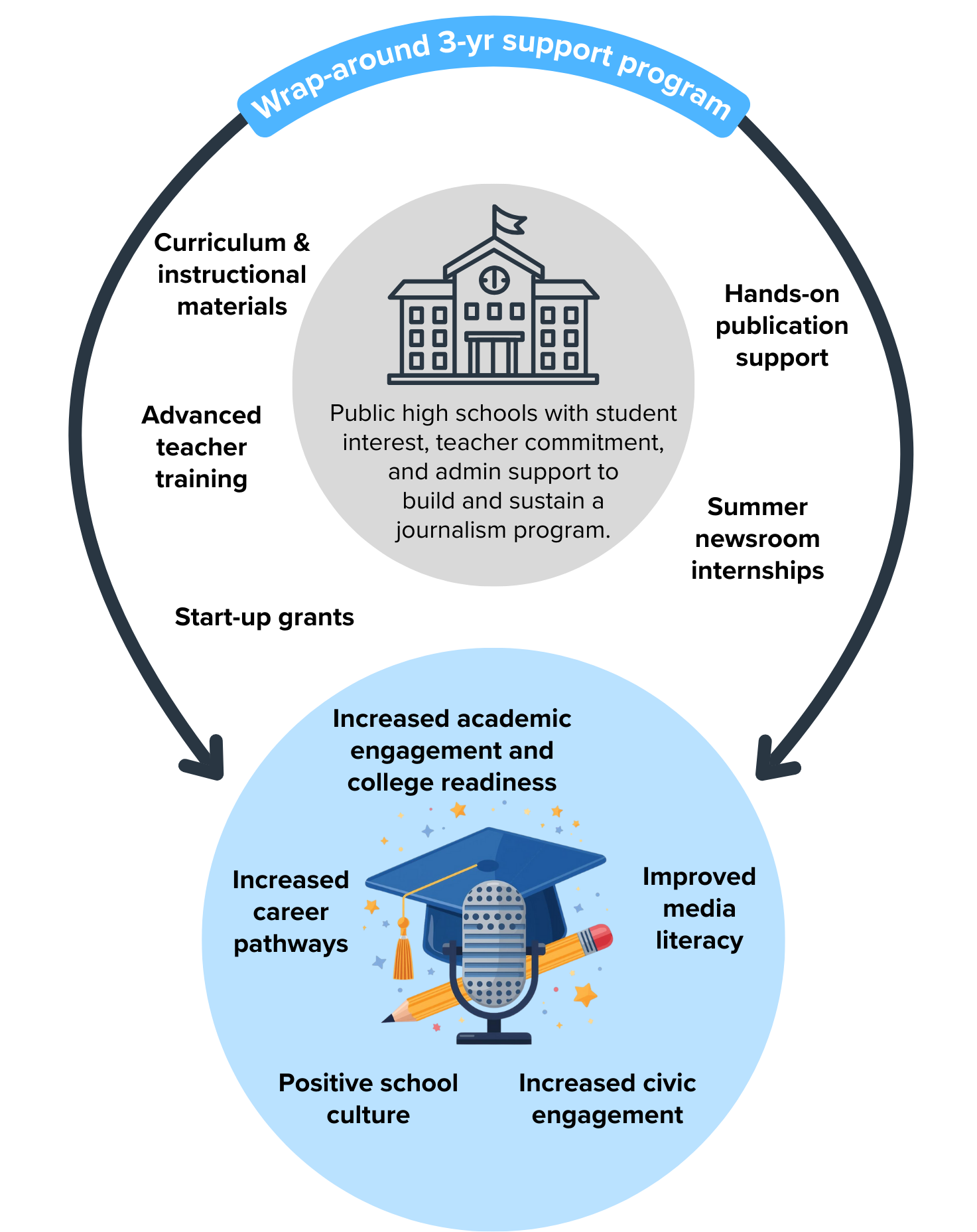 Schools receive funding and in-kind services to sustain and grow their programs, and placements for select students in newsroom internships